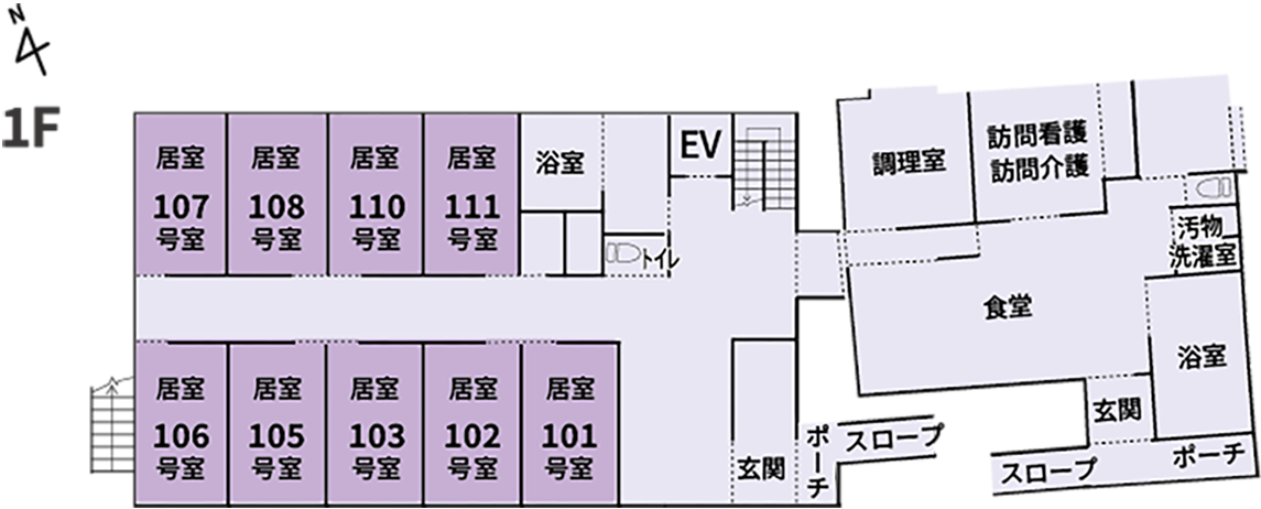 | 共有設備 | 食堂、談話室、浴室、トイレ、洗面所、面談室、洗濯室、エレベーター |