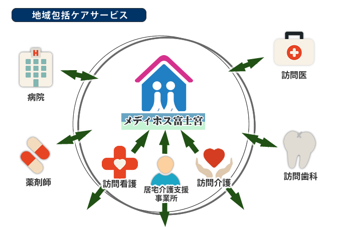 | 施設内併設 | メディホス訪問看護富士宮、メディホス訪問介護富士宮(介護保険サービス、障害福祉サービス) ※上記事業所のご利用は強制ではありません。 |