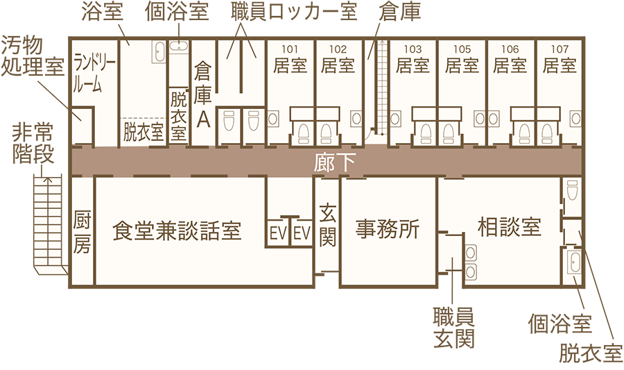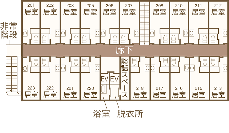 | 居室区分 | 2階建て 25室 全室個室(19.54㎡) |