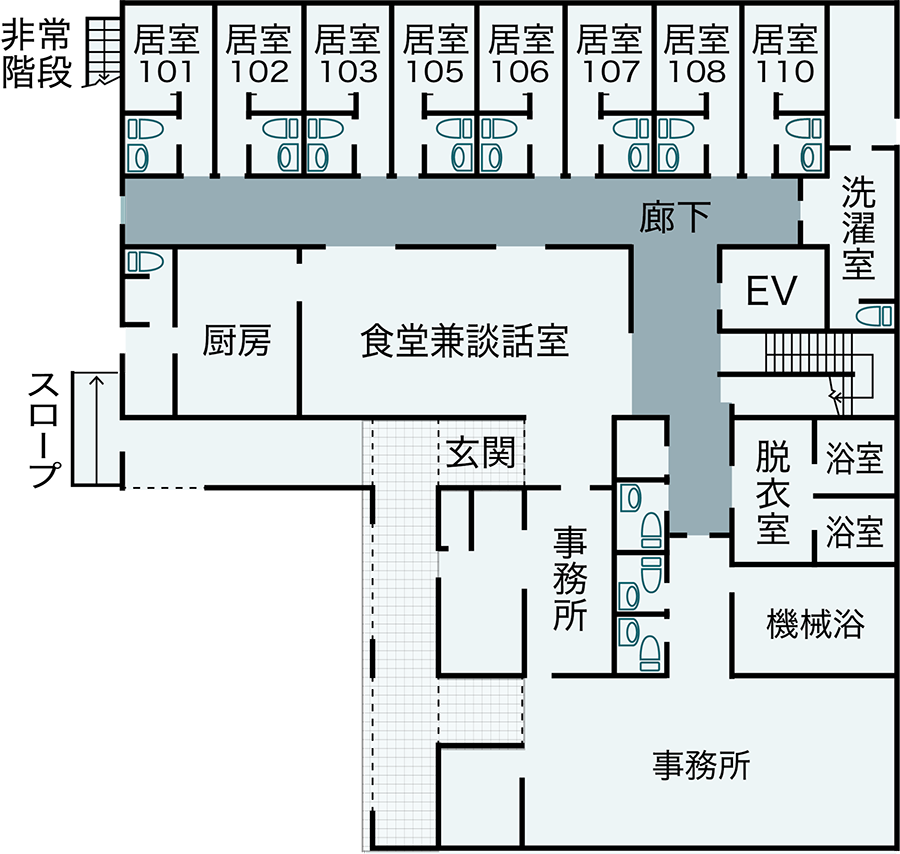共有設備 | 食堂兼談話室、浴室、トイレ、洗面所、面談室、洗濯室、エレベーター |