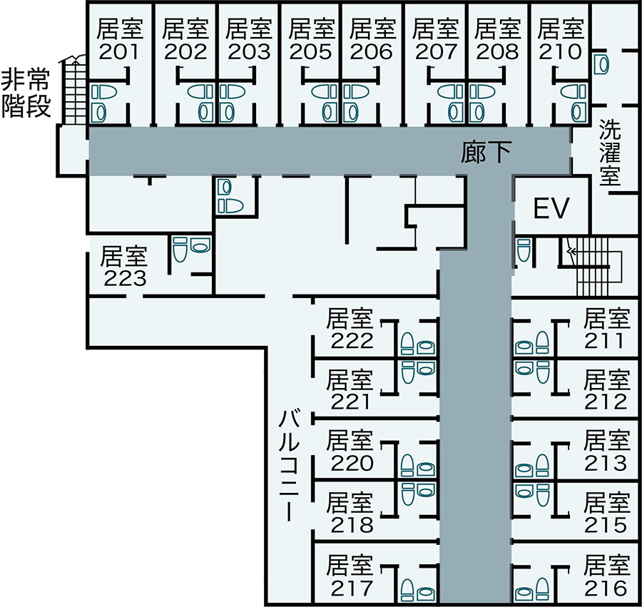 居室区分 | 2階建て 27室 全室個室(13㎡) |