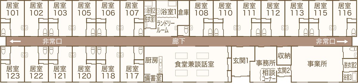 居室区分 | 1階建て19室 全室個室(19.54㎡) |